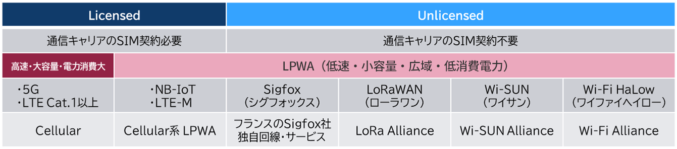 また、同じく第1回目でご紹介した“Licensed系” (通信キャリア回線: docomo, au, Softbank, 楽天)が「Cellular(LTE)」、「Cellular(5G)」、及び「LPWA」の一部に当たります。