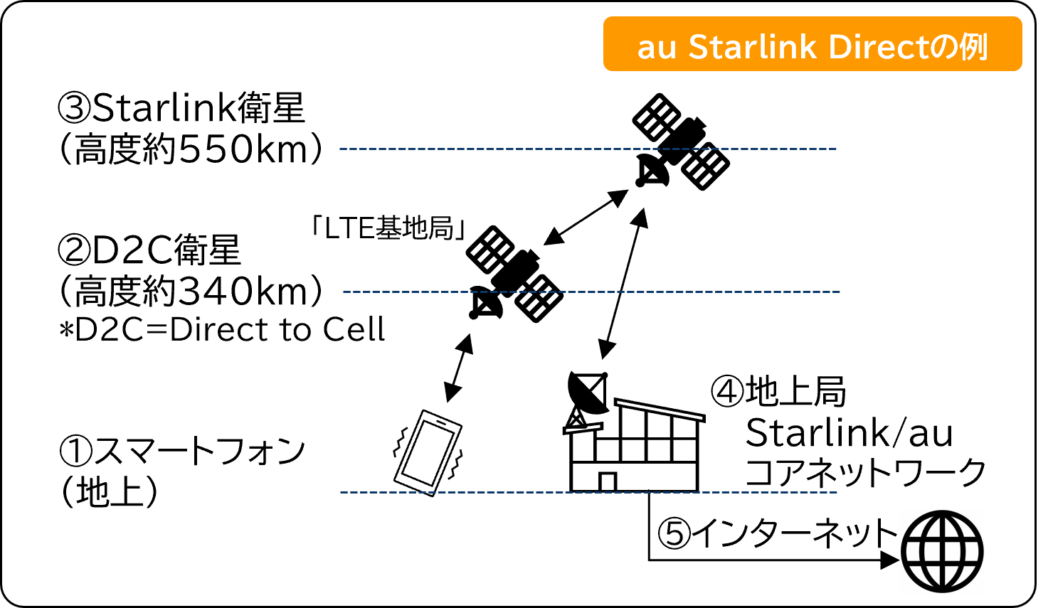 ①スマートフォン → ②D2C衛星 → ③Starlink衛星 → ④地上局/コアネットワーク → ⑤インターネット