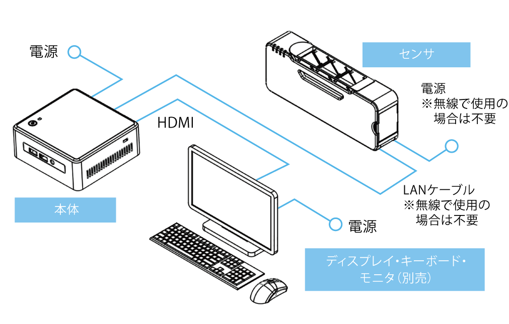 センサで実像化されたデータは、本体で粒子数や粒子径などに変換され、ディスプレイに表示されます。センサと本体の接続は有線・無線が選択でき、センサ専用バッテリも内蔵しているため、遠隔監視も可能です。