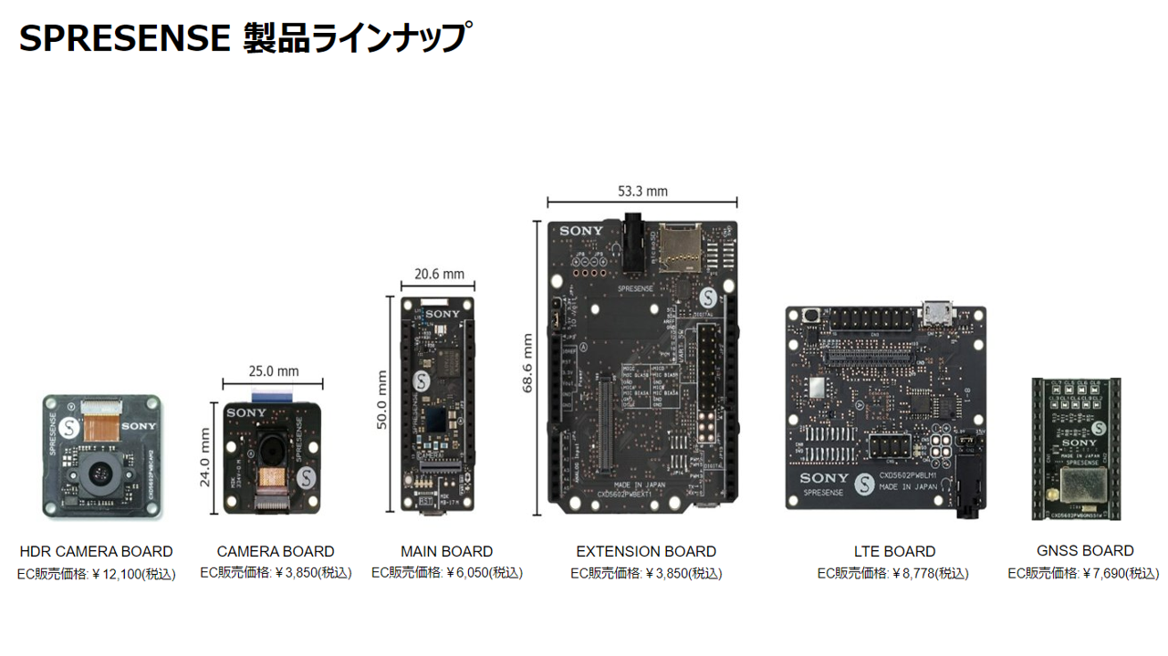 SPRESENSE 製品ラインナップ HDR CAMERA BOARD EC販売価格: ¥12,100(税込) CAMERA BOARD EC販売価格: ¥3,850(税込) MAIN BOARD EC販売価格: ¥6,050(税込) EXTENSION BOARD EC販売価格: ¥3,850(税込) LTE BOARD EC販売価格: ¥8,778(税込) GNSS BOARD EC販売価格: ¥7,690(税込)