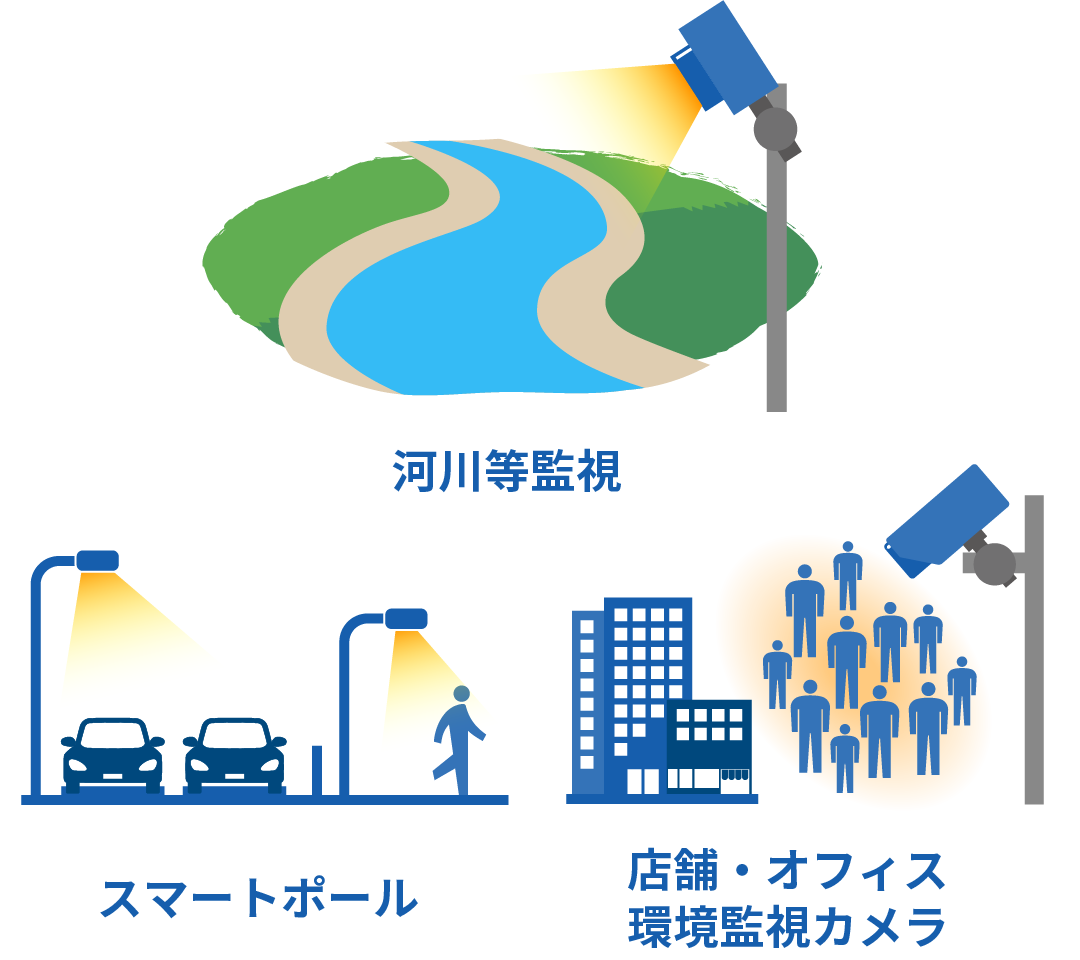 SPRESENSEを活用したスマートポールや監視カメラによる河川・店舗・オフィス環境の監視を示す図。